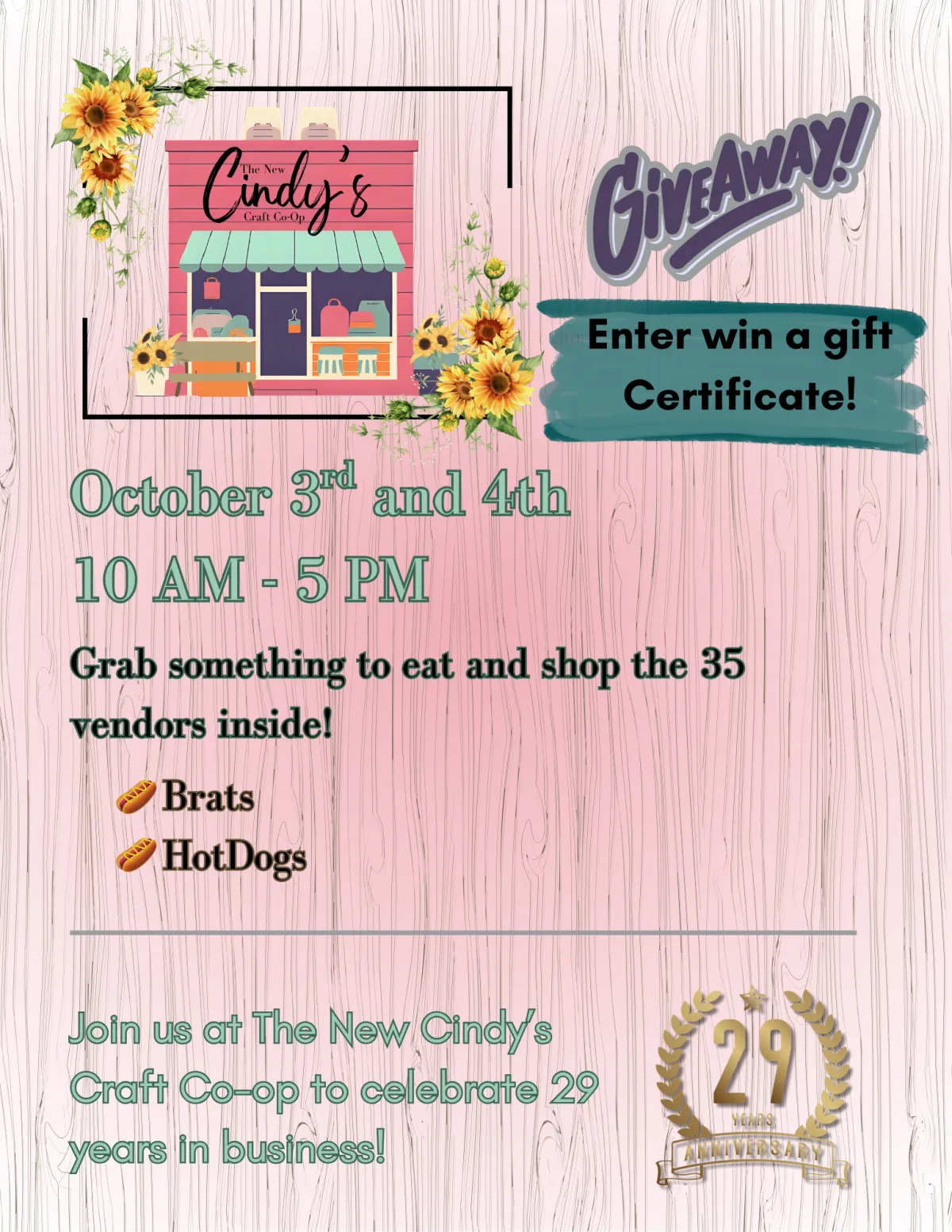 Join us October 3rd and 4th as we grill up some hot dogs and brats to celebrate our anniversary! Grab some food and shop our over 30 vendors inside! The perfect way to start your Christmas shopping, and hey, you might even win a gift certificate!